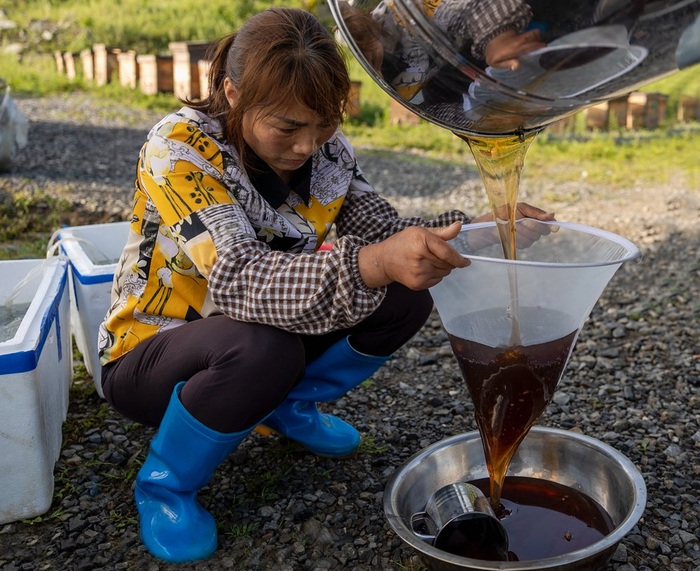 8月22日,丰都县南天湖镇,养蜂人现场过滤蜂蜜。