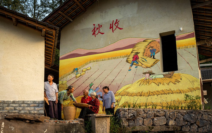 9月16日,丰都县栗子乡,村民们坐在屋檐下谈笑风生。