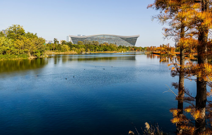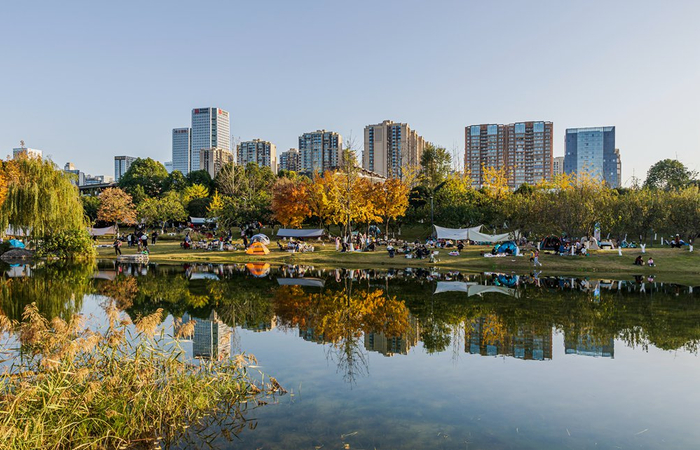 11月26日,成都锦城公园,湖中嬉水玩耍的野鸭给公园带来了绿色和生机。