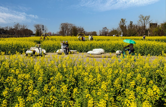 3月8日,四川成都,人们踏春赏油菜花。