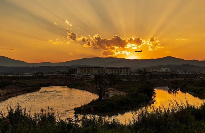 2月5日,云南省景洪市,光芒四射的金色晚霞令人心旷神怡。