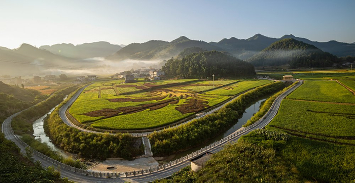 9月8日,丰都县包鸾镇,彩色稻谷在霞光映照下随风起伏。