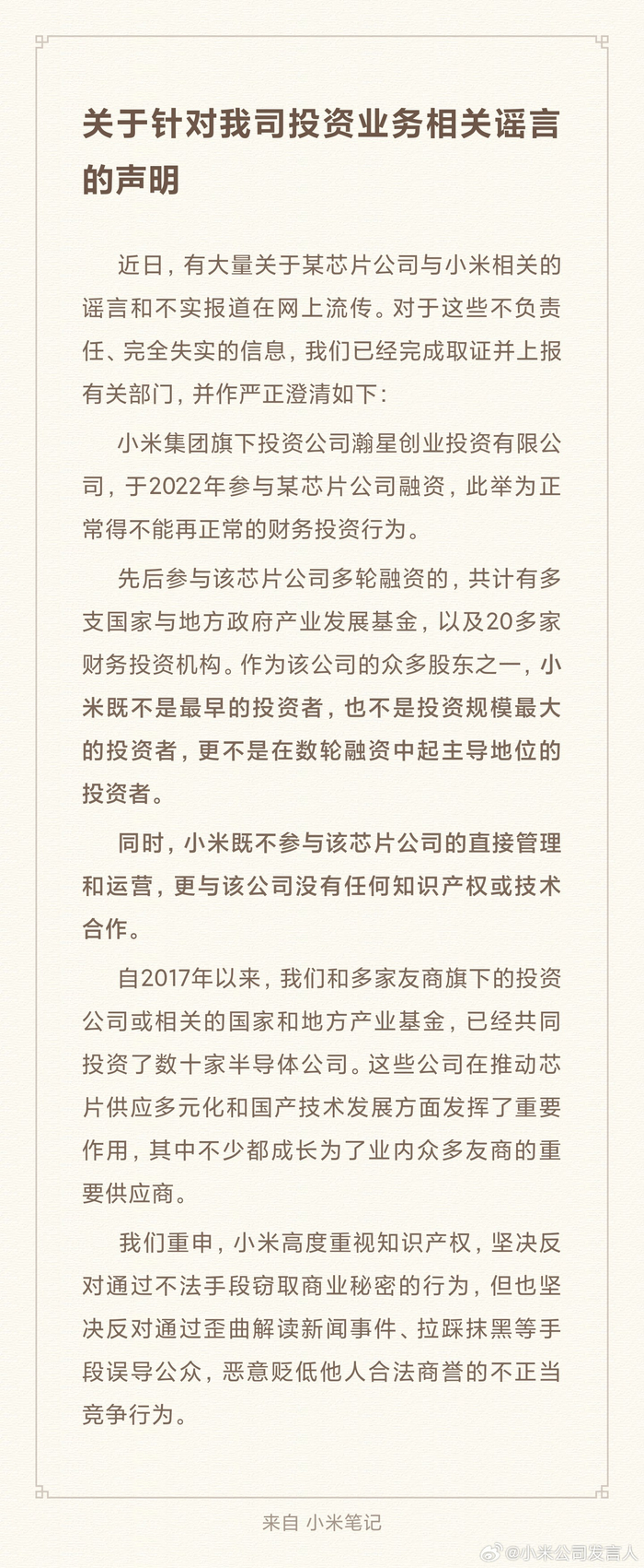 小米表示,先后参与该芯片公司多轮融资的,共计有多支国家与地方政府产业发展基金,以及20多家财务投资机构。作为该公司的众多股东之一,小米既不是最早的投资者,也不是投资规模最大的投资者,更不是在数轮融资中起主导地位的投资者。同时,小米既不参与该芯片公司的直接管理和运营,更与该公司没有任何知识产权或技术合作。