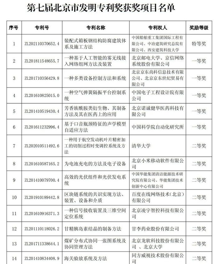 第七届北京市发明专利奖名单公布!36个项目获奖