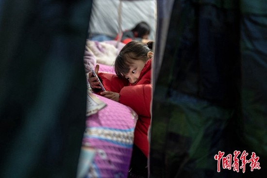 12月22日,大河家镇陈家村安置点,6岁的苏雅婷在帐篷里玩手机,地震时落下的天花板将她的右脸擦伤。中青报·中青网记者 李隽辉/摄