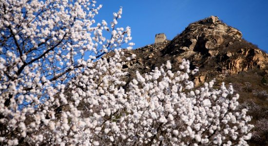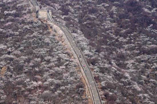 游客在山花遍野的慕田峪长城景区参观游览(2023年3月29日摄)。