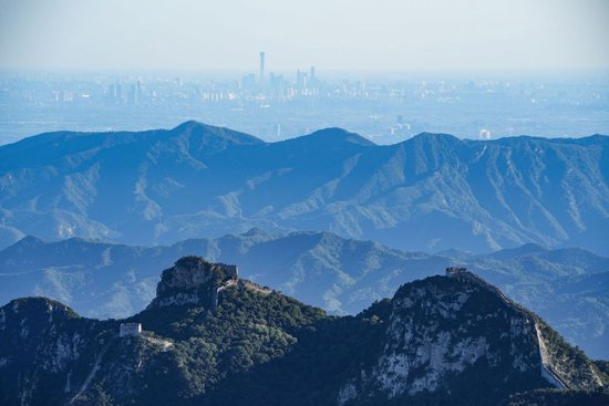 箭扣长城和远处北京城区的建筑群(2022年9月5日摄)。