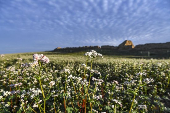 宁夏吴忠市盐池县一处长城脚下荞麦花开放(2023年8月18日摄)。