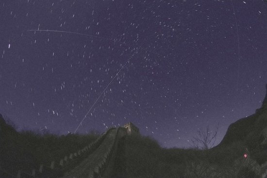 在北京延庆水关长城拍摄的中国空间站过境照片(从左下向右上的轨迹为中国空间站,轨迹为多张照片堆栈,2021年12月12日摄)。