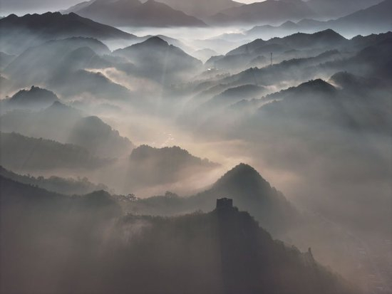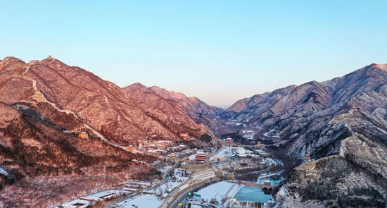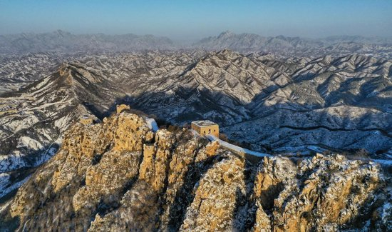 在晨曦中拍摄的雪后司马台长城(无人机照片,2023年2月19日摄)。