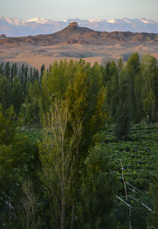 甘肃省敦煌市阳关遗址前的绿洲(2013年9月5日摄)。