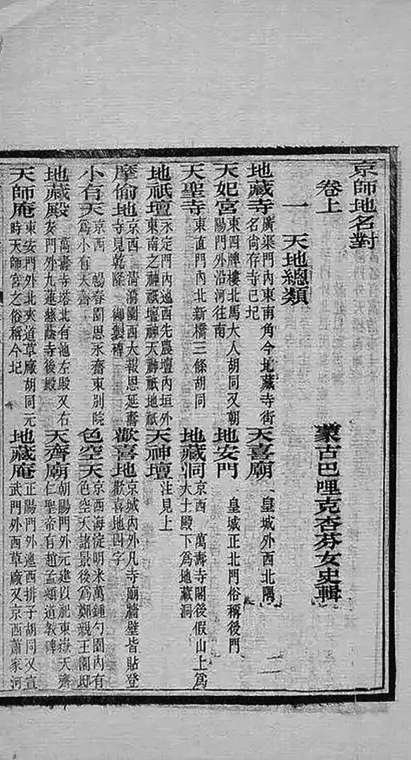 巴里克杏芬所撰地名对中,时时流露出其学识之渊博,如朝阳洞对庆云楼。朝阳洞在西安门内,如今已经没有遗迹可寻,庆云楼是家饭庄,在烟袋斜街,曾停业百余年,近日又在旧址附近重张开业。观澜榭对点石斋,虽观澜与点石相对有些勉强,但让人们从其对小注中知道观澜榭在畅春园中,点石斋是家书铺,不过“今圯”,不知在琉璃厂什么地方。嵩祝寺对泰和楼,对仗不是很严谨,但是它在小注中标明泰和楼是一家大酒楼,嵩祝寺是清代活佛章嘉胡图克图的“梵修之所”,并告诉人们这里“本明番汉经厂”。