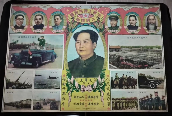 宣传画《中华人民共和国人民领袖》,横幅,高53.3cm,宽76.9cm。画面居中大幅的是毛泽东主席新中国成立初期标准画像,上部用齿轮,两边用麦穗,下部用五谷丰登的枝叶装饰,有局部借用国徽轮廓的痕迹。毛泽东画像下部的豆黄底色上印有文字,左右对称的大字是“人民武装力量,保卫世界和平”。中间是“繁荣经济,公私兼顾,发展生产,劳资两利”,用红色五角星间隔,这是对新中国成立初期党中央十六字方针的宣传。画面上部用多面五星红旗装点,一边是刘少奇、李济深、高岗副主席头像,另一边是朱德、宋庆龄、张澜副主席头像。毛泽东画像的两边,各由5幅新闻图片组成,一边是朱德总司令站立在敞篷车上检阅部队的威武形象。接下来是高射炮队、空军部队、装甲部队和坦克车队特写照片。另一边是新中国人民武装部队在天安门广场前接受检阅的壮观场面。接下来是骑兵部队、步兵部队、海军部队等的特写照片。