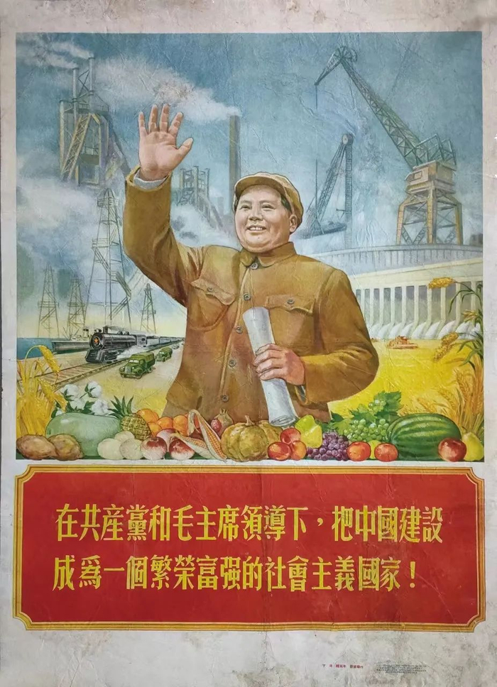 宣传画《在共产党和毛主席领导下,把中国建设成为一个繁荣富强的社会主义国家》,竖幅,高109.2cm,宽78.7cm,主画面是身穿领袖服、头戴帽子的毛主席,一只手手持我国的第一个五年计划计划书,一只手高举着,象征着号召全党、全军、全国人民行动起来向建设社会主义强国进军。画面下方是中国农业五谷丰登的具体展示:两边是饱满的麦穗和谷穗,中间排列着棉桃、蜜桃、玉米、土豆、红薯、南瓜、西瓜、冬瓜、苹果、香梨、葡萄、菠萝、石榴、西红柿,呼之欲出。围绕在毛主席周围的是热气腾腾的新中国建设场面,水上的轮船,工厂的烟囱,行进中的火车,建设中的塔吊,流水喷涌的水坝,望不到边的汽车运输队,遍布田野的高压电线塔等等。