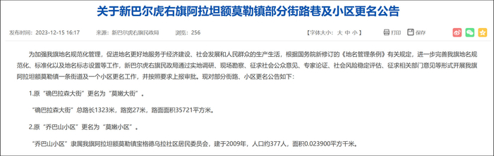 依据《地名管理条例》中的“不以外国人名、地名作地名”之规定,内蒙古呼伦贝尔市新巴尔虎右旗民政局12月15日发出公告称,原“确巴拉森大街”更名为“莫嫩大街”,原“乔巴山小区”更名为“莫嫩小区”。