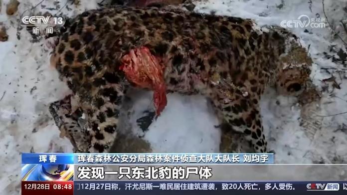 通过现场勘验,警方初步认定这是一只成年的东北豹,于几个小时前被猎杀啃食。