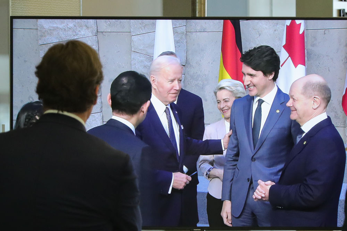 2022年3月24日,在比利时布鲁塞尔的北约总部,一名男子观看屏幕上美国总统拜登(右四)、欧盟委员会主席冯德莱恩(右三)、加拿大总理特鲁多(右二)、德国总理朔尔茨(右一)出席七国集团峰会合影仪式的画面。新华社记者郑焕松摄