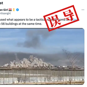 近日,社交平台流传一则视频称,以色列疑似对加沙地带使用了“战术性核武器”,56栋建筑物瞬间灰飞烟灭。视频画面中的建筑被滚滚升起的浓烟包围,画面外充斥着此起彼伏的爆炸声和欢呼声。