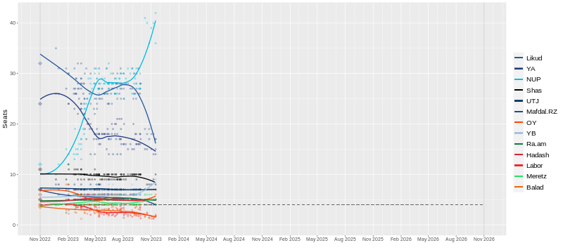 以色列民调平均,浅蓝为“国家团结联盟”,蓝为“利库德集团”,另一反对党“未来党”是紫蓝(绘者:Basque mapping)