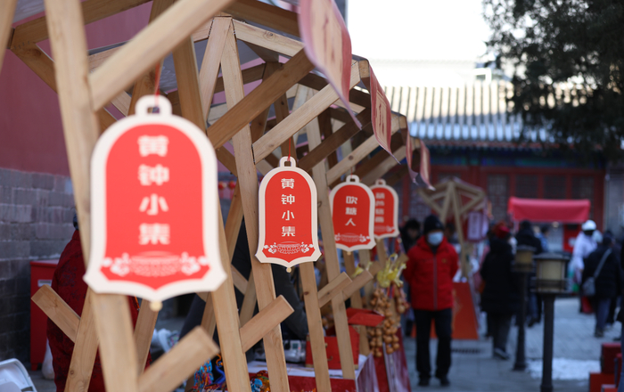 “铛——铛——铛——”12月31日10时,伴着浑厚悠扬的钟声,大钟寺古钟博物馆的“黄钟小集”开市。当天,有着600年历史的永乐大钟在全天5个时段鸣响108声,3200余市民走进博物馆,逛年味市集,在钟声中为即将到来的2024年祈福纳瑞。