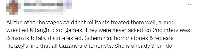 这两期采访节目,与谢姆早些时候所说的内容差异巨大,令不少网民咋舌。在获释的那天,她曾表示,加沙人很友善,哈马斯对她很好,食物也很美味,一切都很好。