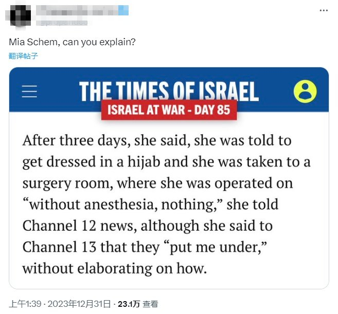 还有网民关注到《以色列时报》中披露的一个细节,发现谢姆在两次以媒采访中说的话前后矛盾。“她对以色列12频道说自己在没有麻醉的情况下做了手术,但在13频道又说哈马斯对她进行了麻醉。谢姆,你能解释一下吗?”