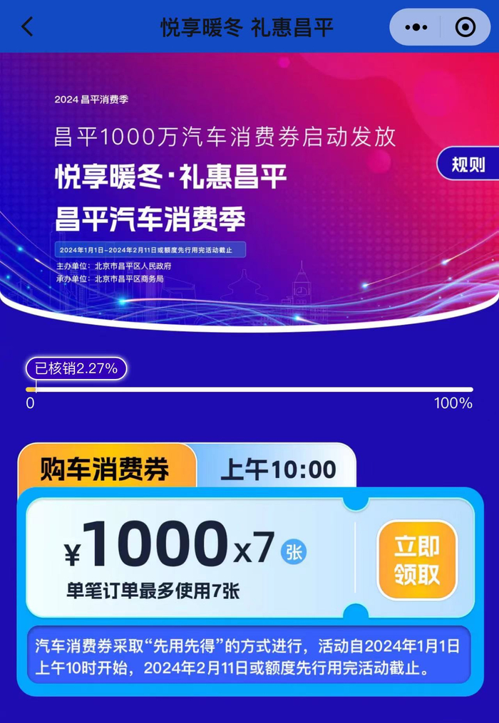 1月1日,2024年昌平区第一期1000万元汽车消费券,正式通过“消费地图”微信小程序平台进行发放,消费者购车最高可享受7000元补贴,可通过“消费地图”微信小程序平台领取。