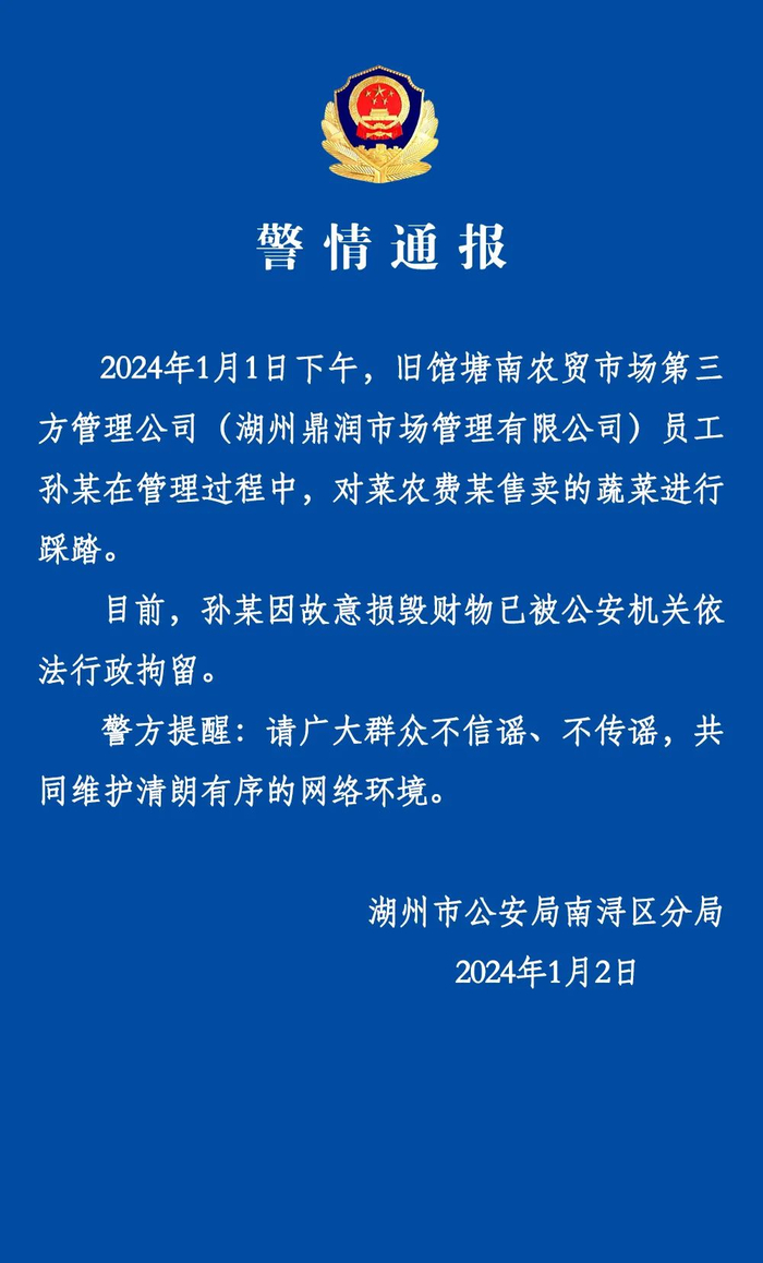 湖州警方:一农贸市场管理公司员工故意踩踏菜农蔬菜,被行拘