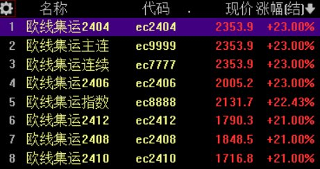 1月3日,集运指数(欧线)主力合约延续昨日涨势,截至发稿,集运指数(欧线)EC2404、EC2406、EC2408、EC2410、EC2412合约全线涨停。