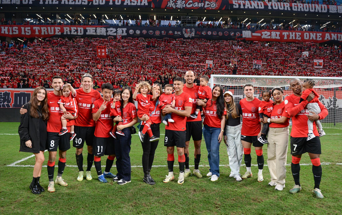 2023年11月4日,入籍球员艾克森(9号)与成都蓉城多名外援及家人合影。 图/IC photo