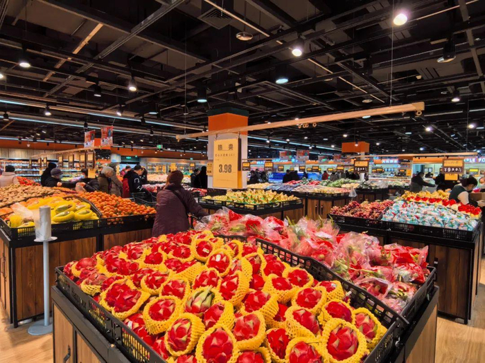 今天,小石来到幸福荣耀生活超市,看到各类瓜果蔬菜、干货蛋肉等主要产品种类齐全、供应充足。各类生鲜、日化和知名水果品牌纷纷入驻,超市内商品琳琅满目,虽然是工作日时间,但店内顾客络绎不绝。