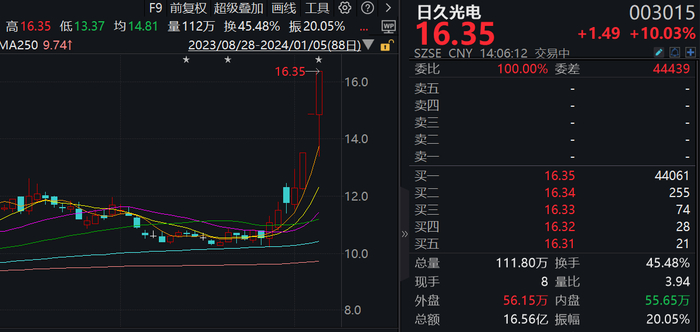 日久光电上演“地天板” 成交额超16亿元