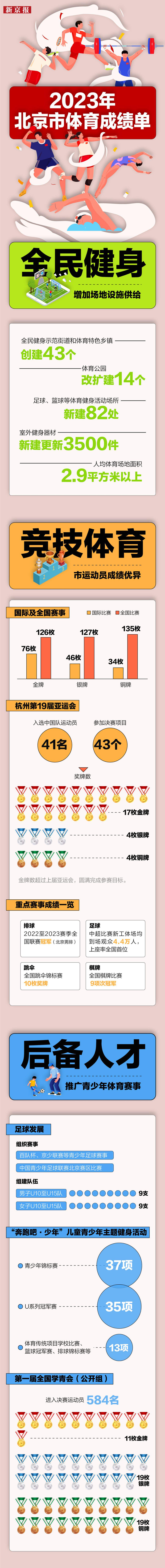 新京报讯 1月5日,2024年北京市体育工作会议在京举行,发布《2024年北京市体育工作报告》。首要议题“2023年首都体育发展主要成绩”,通过全民健身供给、竞技体育成绩、后备人才建设、体育产业数据、冬奥长尾效应、重大赛事举办等,梳理首都体育过去一年的工作。