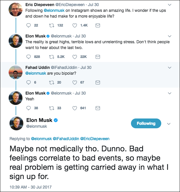 包括马斯克自己在内的一部分人将他的古怪行为归因于他的心理问题。2017年,一名推特用户曾询问马斯克是否患有双相情感障碍,马斯克对此给予了肯定的回答,但同时表示自己还没有确诊。马斯克2021年主持综艺节目《周六夜现场》时说,他患有阿斯伯格综合征,这是一种自闭症谱系障碍。