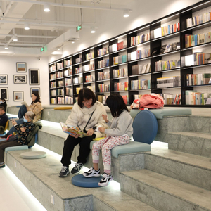 走进艺术中心,一楼是三联韬奋书店的旗舰店,设有亲子阅读区、咖啡区,售卖的文创商品也非常有特色,旁边还专门开辟了儿童体育拓展项目。二层的“可艺术中心”推出了“李可染、李小可水墨作品展”,观众可免费预约观展。三楼是“一方剧场”,可以根据需要变成多种形式,未来这里还会有多种可能,比如与开心麻花、嘻哈包袱铺开展合作,为社区居民带来喜剧、相声表演。