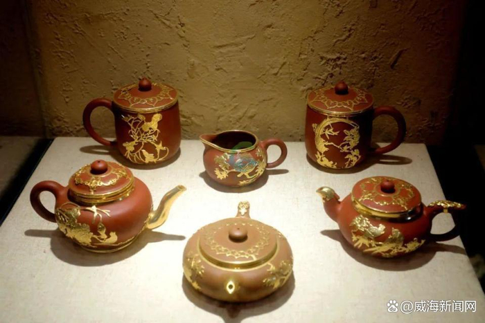 良辰美景之下,还有一处文化展馆,将“锡镶”这一威海独一无二的非遗技艺珍藏起来,众多锡镶工艺壶被加工上不同形状的锡镶,赋予每一把器物以灵魂,无愧流淌在器皿上的艺术。