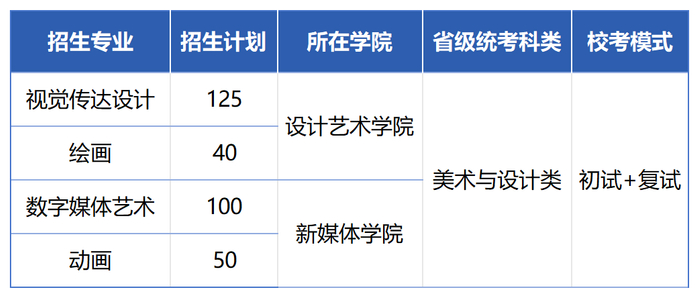 视觉传达设计、绘画、数字媒体艺术和动画专业面向全国所有省份招生(不含港澳台),不编制分省计划(最终招生计划数以上级主管部门批复为准),专业兼报,按照美术与设计类发放校考合格证。