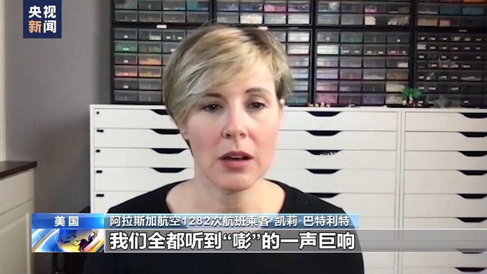 阿拉斯加航空1282次航班乘客 凯莉·巴特利特:机组人员他们广播通知后没过多久,我们全都听到“嘭”的一声巨响,非常可怕,飞机瞬间被风和空气灌满。很吵,风很大,声音很大,可以听见外面的飞机引擎声,还有飞机内部的空气流动声,因为风全进来了。我很庆幸没有出现更坏的结果,就是这样。我时常还会想起当时的场景。