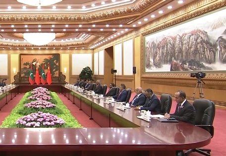 1月10日下午,国家主席习近平在人民大会堂同来华进行国事访问的马尔代夫总统穆伊兹举行会谈。两国元首宣布,将中马关系提升为全面战略合作伙伴关系。