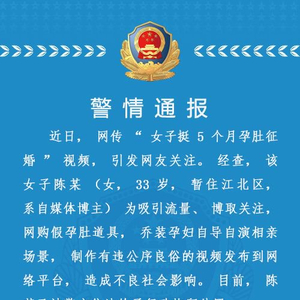 重庆市公安局江北区分局官方微博消息,网传“女子挺5个月孕肚征婚”视频,引发网友关注。经查,该女子陈某(女,33岁,暂住江北区,系自媒体博主)为吸引流量、博取关注,网购假孕肚道具,乔装孕妇自导自演相亲场景,制作有违公序良俗的视频发布到网络平台,造成不良社会影响。目前,陈某已被警方依法给予行政拘留处罚。