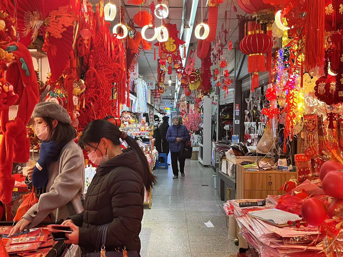 记者注意到,随着新年的临近,前来小商品市场选购年货的人也渐渐多了起来。上海本地人王姐在上个月回国探亲,50多岁的她在十多年前跟着家人移民美国。她告诉第一财经,她年轻的时候每年逢年过节都会和自己的母亲来这里选购一些小饰品,“当年这里的生意还是很好的”。后来移民美国,每次回国,王姐依旧会习惯性地来逛逛,因为“这里东西多,要啥有啥,琳琅满目。”她回忆在小商品城买过各种中国风格的冰箱贴、小屏风还有折扇,后来都当成了伴手礼送给同事和邻居,对方都很喜欢。