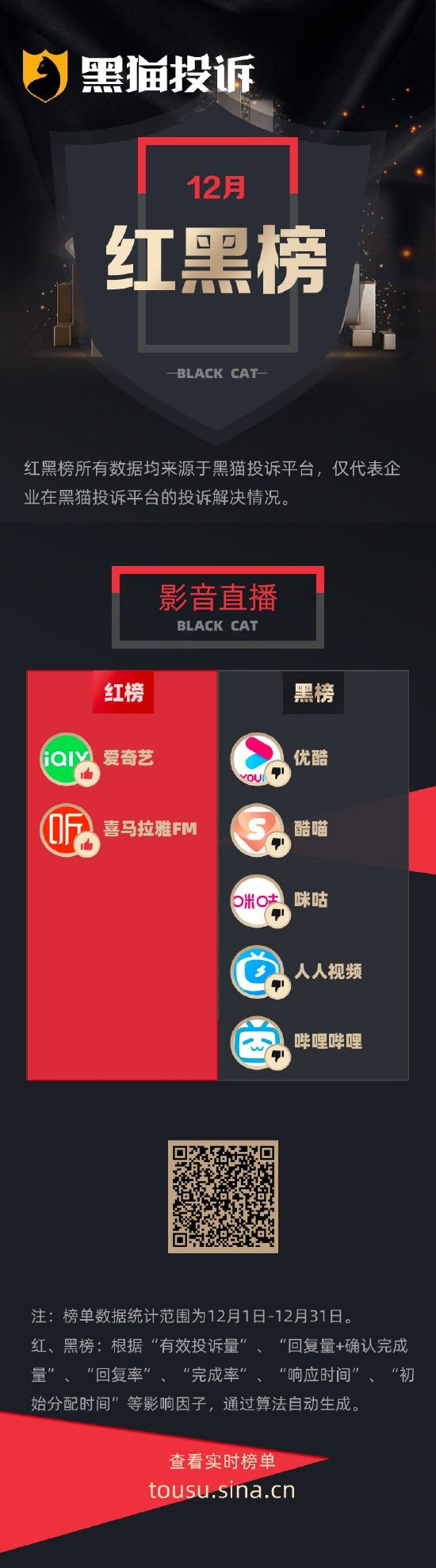 12月黑猫投诉影音直播领域红黑榜:优酷svip诱导付费引争议