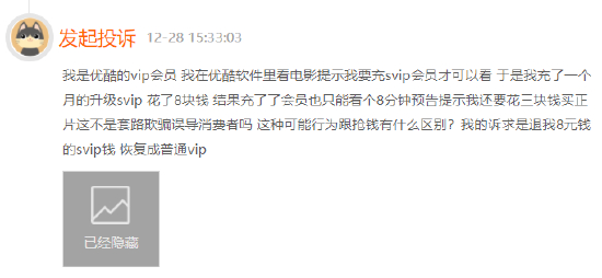 据黑猫投诉数据显示,优酷12月有效投诉单434单,消费者向黑猫平台反馈称:在优酷app观看看电影被提示需要充svip会员才可以看;可升级会员后还是只能看8分钟预告,提示还要花三块钱购买正片才能观看,充值页面虚假宣传。平台上还有其他消费者投诉优酷会员扣费问题,投诉原因主要集中于未经提醒自动续费、会员订阅退订难等相关问题。截至12月底,黑猫投诉平台共收到针对优酷得投诉14200余单,回复率不足1%。