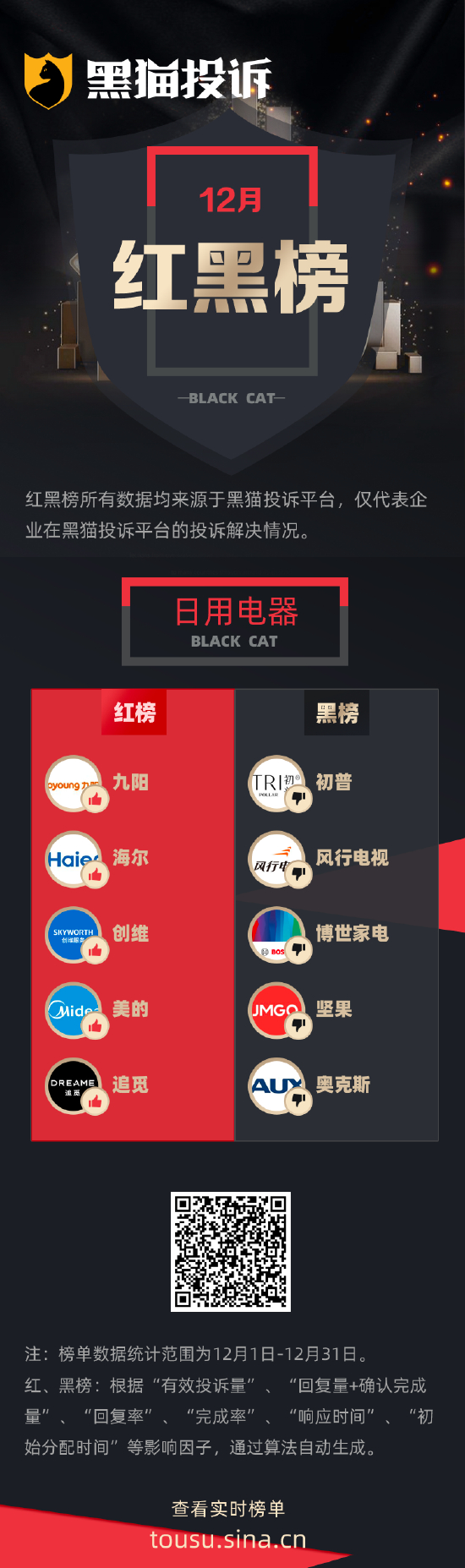 12月黑猫投诉日用电器领域红黑榜:博世烘干机新机多次维修售后拒绝换机