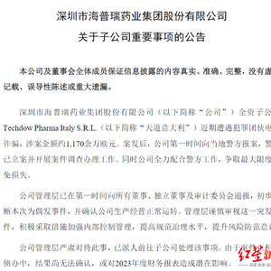 另据第一财经报道,有投资者质疑海普瑞从事出口生意多年,缘何会遭遇诈骗?对此,海普瑞1月15日回应称,由于犯罪团伙的周密布局,因此很遗憾子公司天道意大利成为此次案件受骗者。事件发生后,公司也发现近两年有多家上市公司遭遇电信诈骗。