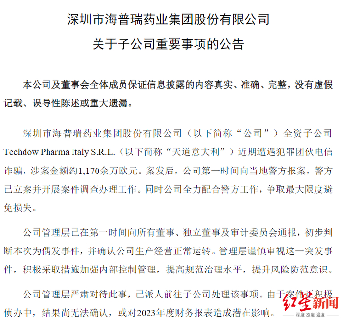红星资本局1月15日消息,昨日晚间,海普瑞(002399.SZ,09989.HK)发布《关于子公司重要事项的公告》称,全资子公司Techdow Pharma Italy S.R.L。(以下简称“天道意大利”)近期遭遇犯罪团伙电信诈骗,涉案金额约1170余万欧元。按最新汇率计算,涉案金额超过人民币9000万元。