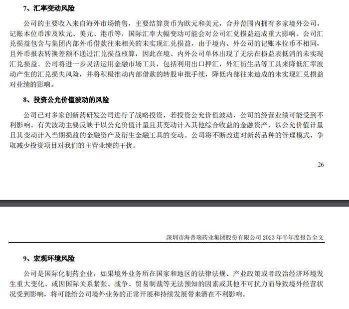 “公司是国际化制药企业,如果境外业务所在国家和地区的法律法规、产业政策或者政治经济环境发生重大变化、或因国际关系紧张、战争、贸易制裁等无法预知的因素或其他不可抗力而导致境外经营状况受到影响,将可能给公司境外业务的正常开展和持续发展带来潜在不利影响。”