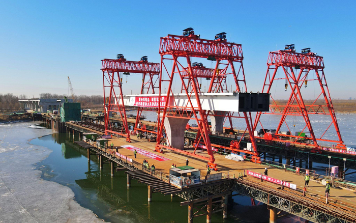据通州公路分局工程管理科田宇介绍,本次施工具有单次起重重量大、吊装高度高、满载运输距离长、水上施工风险高、龙门吊高宽比较大等特点。同时,该项双龙门、大吨位跨河道主梁吊装施工工艺,在国内跨河桥梁建设中尚属首次。