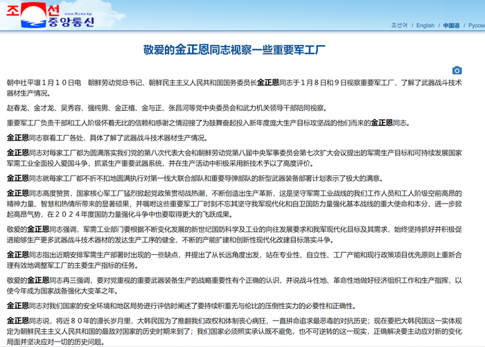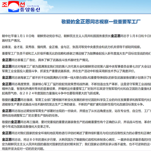 1月10日,朝鲜官媒朝中社报道金正恩视察重要军工厂,除了在照片中展示了工厂生产的疑似箱式火箭炮构建之外,工厂的信息、工厂陪同人员的信息都做了保密处理。