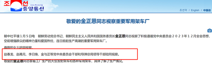1月5日朝中社报道,金与正陪同金正恩视察过程中名列最后